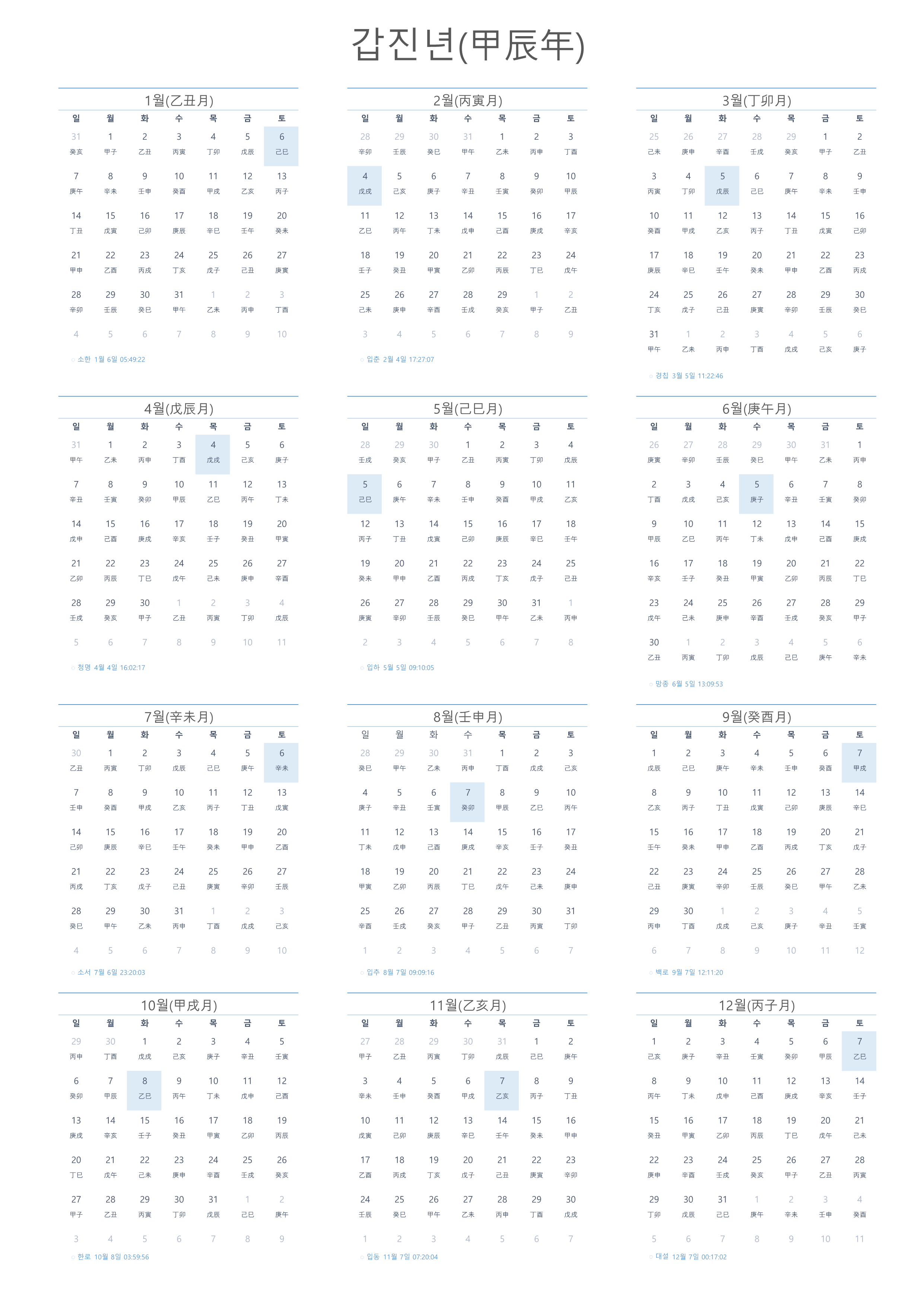 2024년 갑진년(甲辰年) 한자 연간 간지달력 만세력(세로) 엑셀 PDF 다운로드