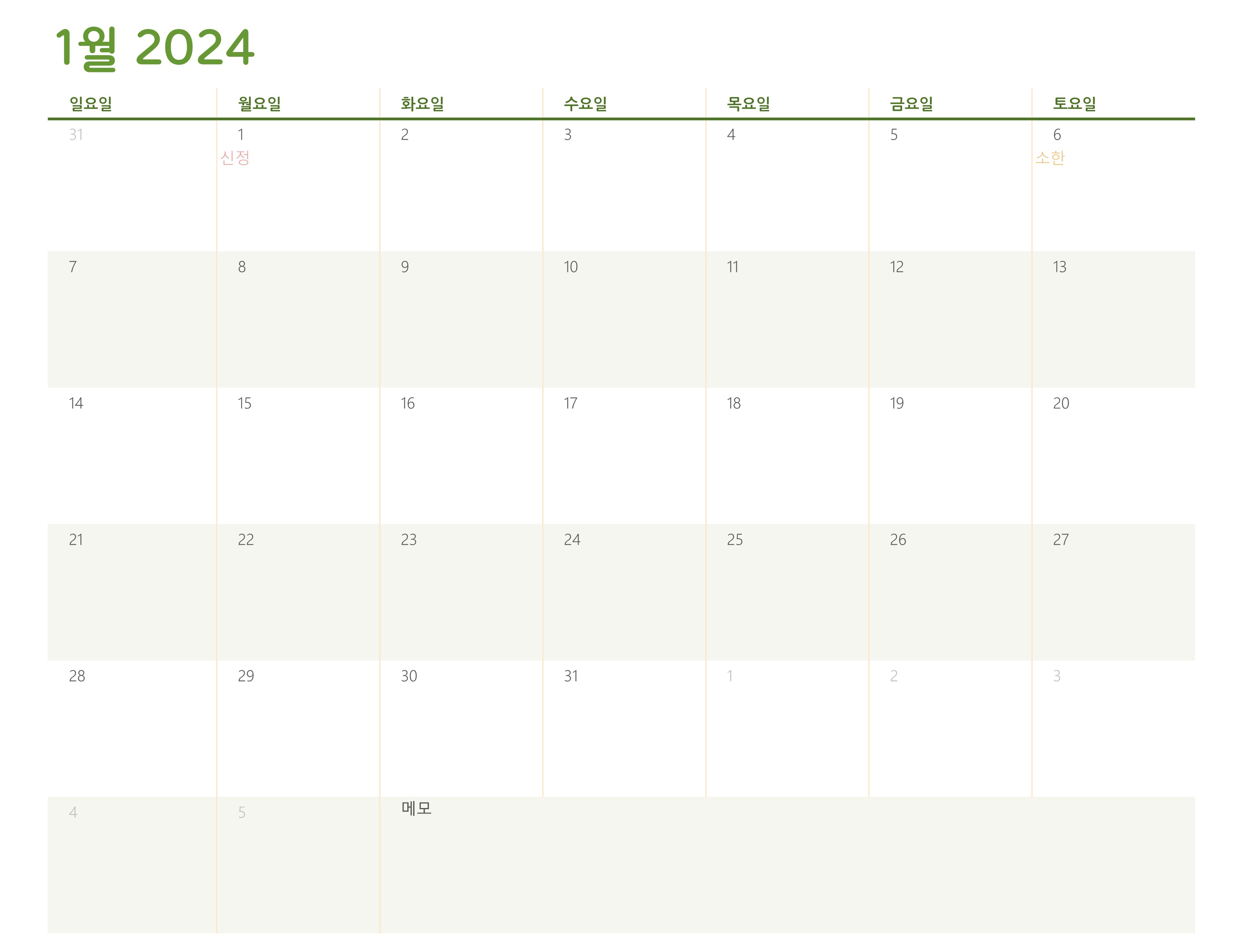 2024년 월별달력 플래너 PDF 엑셀 다운로드