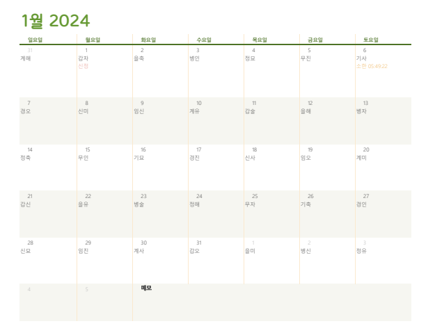 2024 갑진년 월별 만세력 플래 너 엑셀 PDF 다운로드